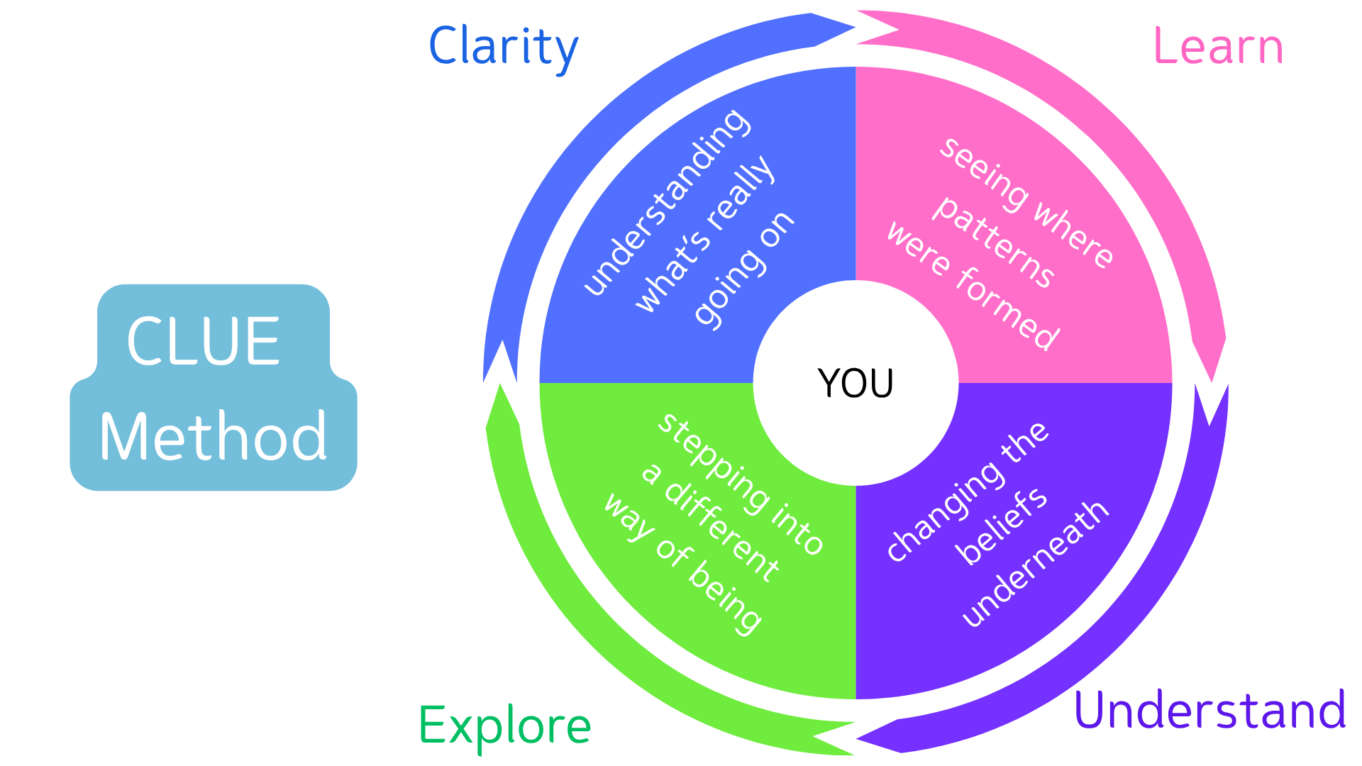 Using the CLUE Method I help you to uncover the blocks and old beliefs, release them and step into your true authentic self.Â